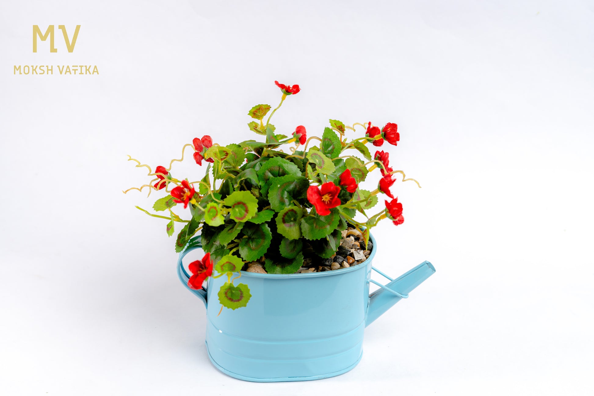 A vibrant artificial red bloom arrangement in a rustic blue Chouette tin planter. Perfect for adding a cheerful, low-maintenance charm to your space.