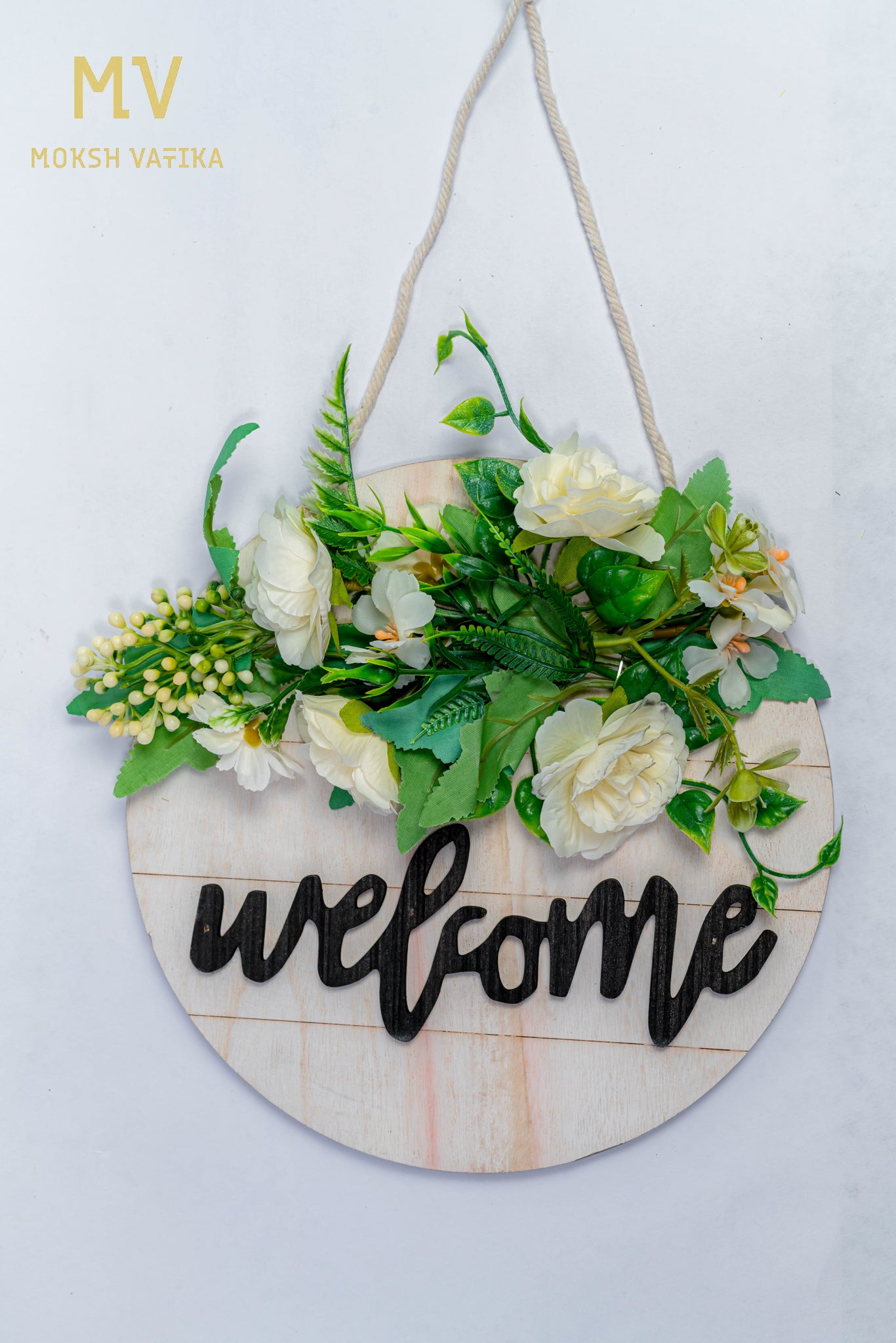 Round wooden wall hanging with cream artificial flowers and "welcome" text. Comes with jute rope for easy hanging.