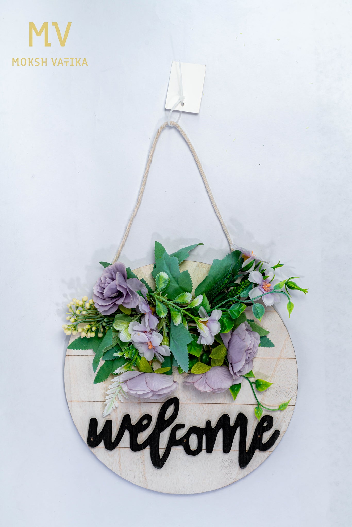Round wooden wall hanging with purple artificial flowers and "welcome" text. Comes with jute rope for easy hanging.