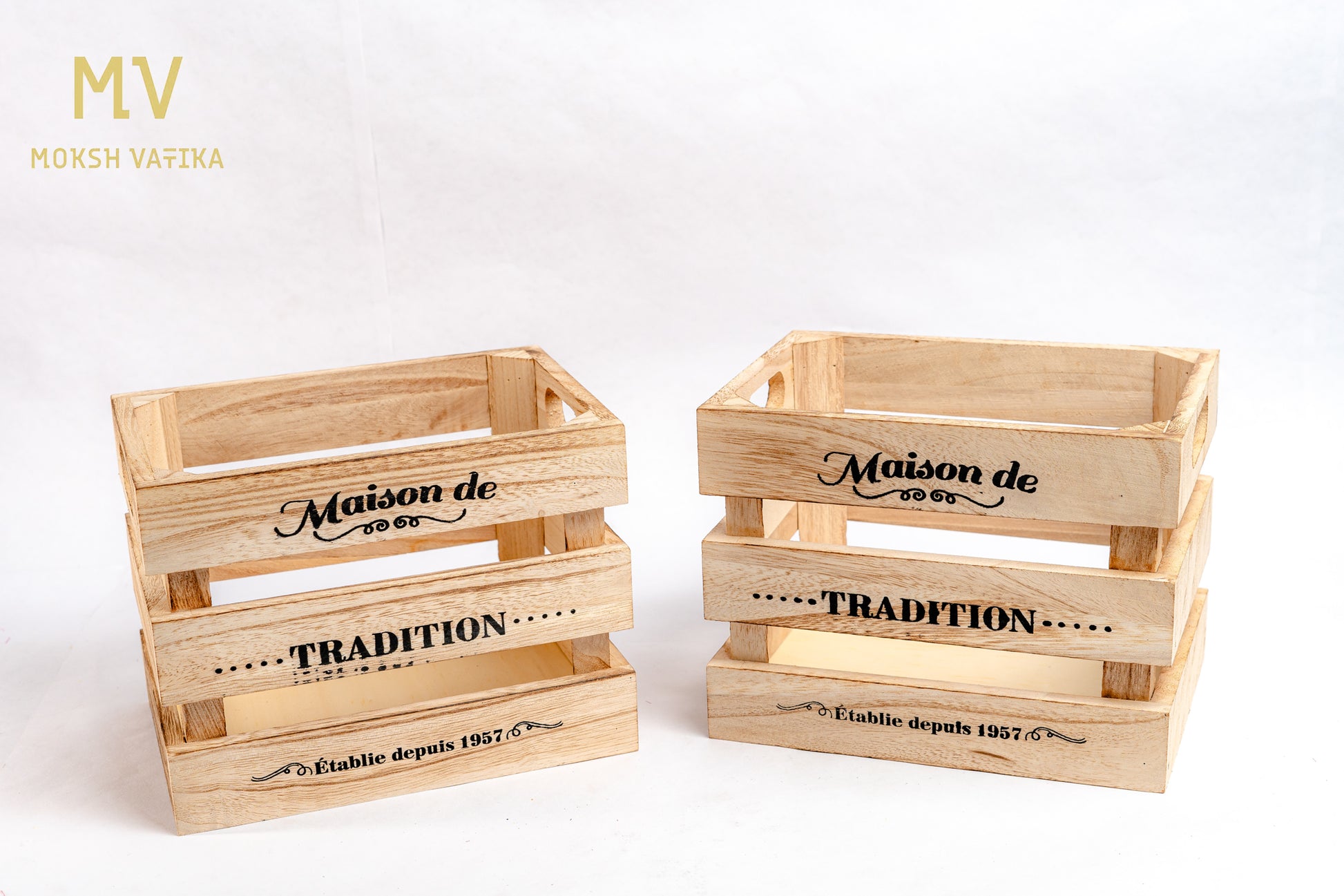 Decorative wooden crates with 'Maison de Tradition' vintage prints. Perfect for French country-style decor or small item display (Set of 3).