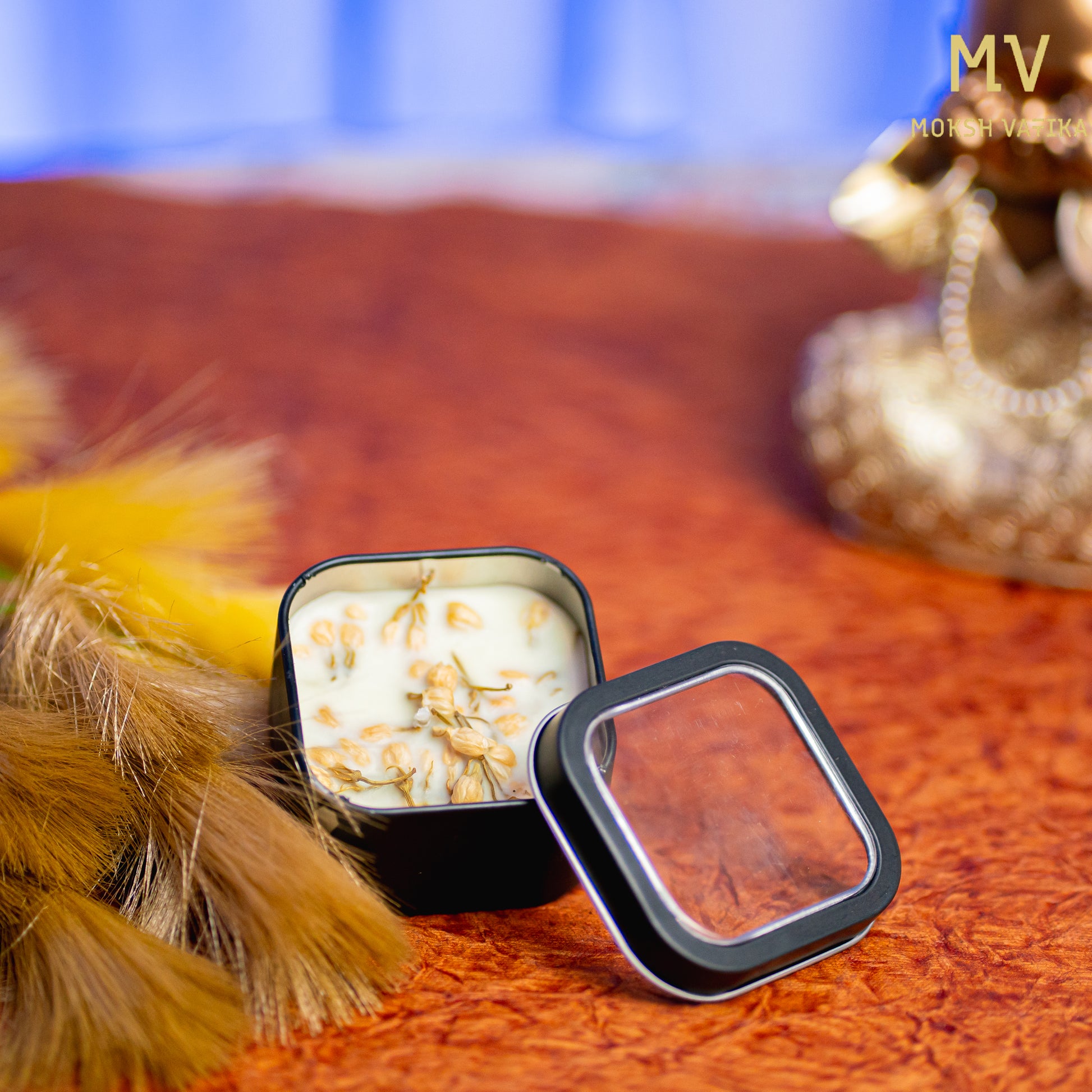 Moksh Vatika – Jasmine Bloom Scented Soy Wax Candle in Black Tin Box