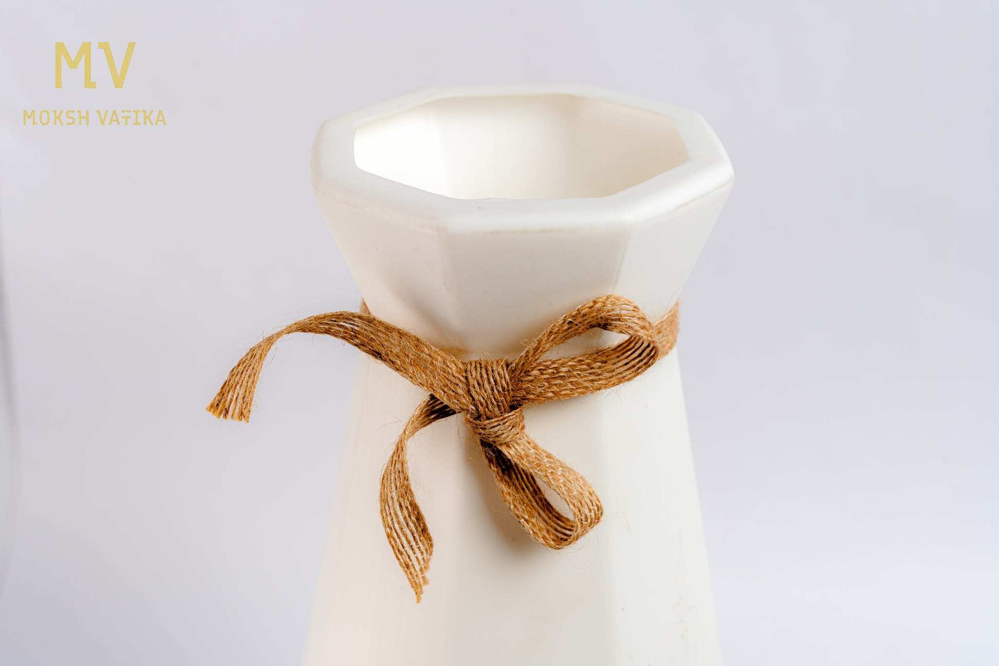 Minimal yet elegant. This matte-finish geometric vase with a rustic jute bow adds charm to any tabletop or shelf.